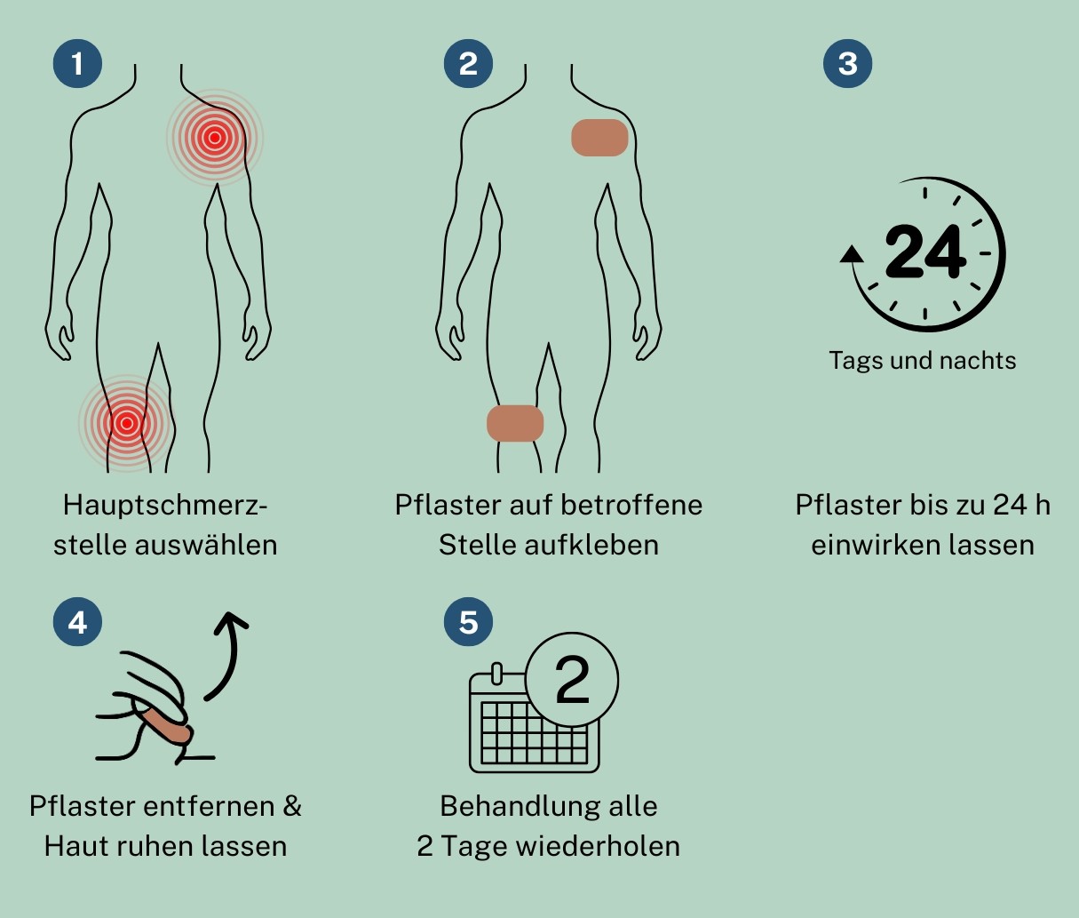 Je nach Bedarf kann das Pflaster alle zwei Tage je Anwendungsstelle verwendet werden (24 Stunden tragen, danach 24 Stunden Pause).
